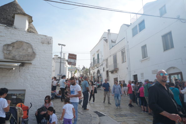 アルベロベッロのメインストリートは大混雑だった。ここではトゥルッリのマグネットと置物、キーホルダーを買って終了。