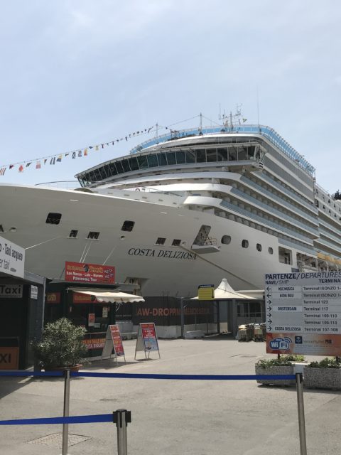 定刻通り、バーリに到着。寄港地によって下船場所は異なり、バーリは2階中央から下船した。下船時は下船全員分のコスタカードを係員にスキャンされるので、忘れずに持っていきましょう。実は子ども分のコスタカードを船室に挿しっぱなしにして忘れてしまい、下船できないと言われてしまった。船室に戻っている時間がなく、何か代替案がないか訪ねたところ、2階のサービスカウンターでも再発行可能とのことだったので、事なきを得た。コスタカードを再発行すると、古い方のカードは失効するので、破棄することを忘れずに。