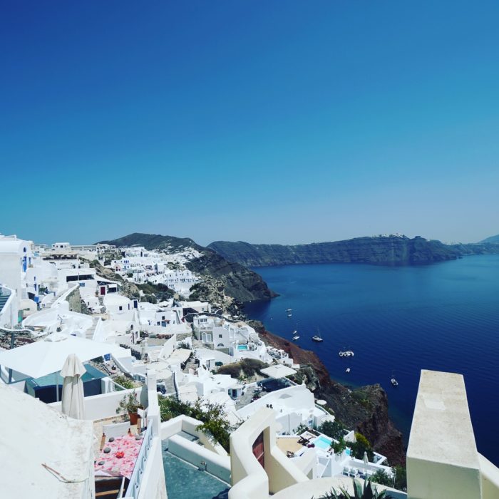 港へ着いてからはバスに乗り換えます。絶景で有名なイアへの道中は観光バスで大渋滞。1時間ほどかかり、しばしのフリータイム。絶景を堪能。