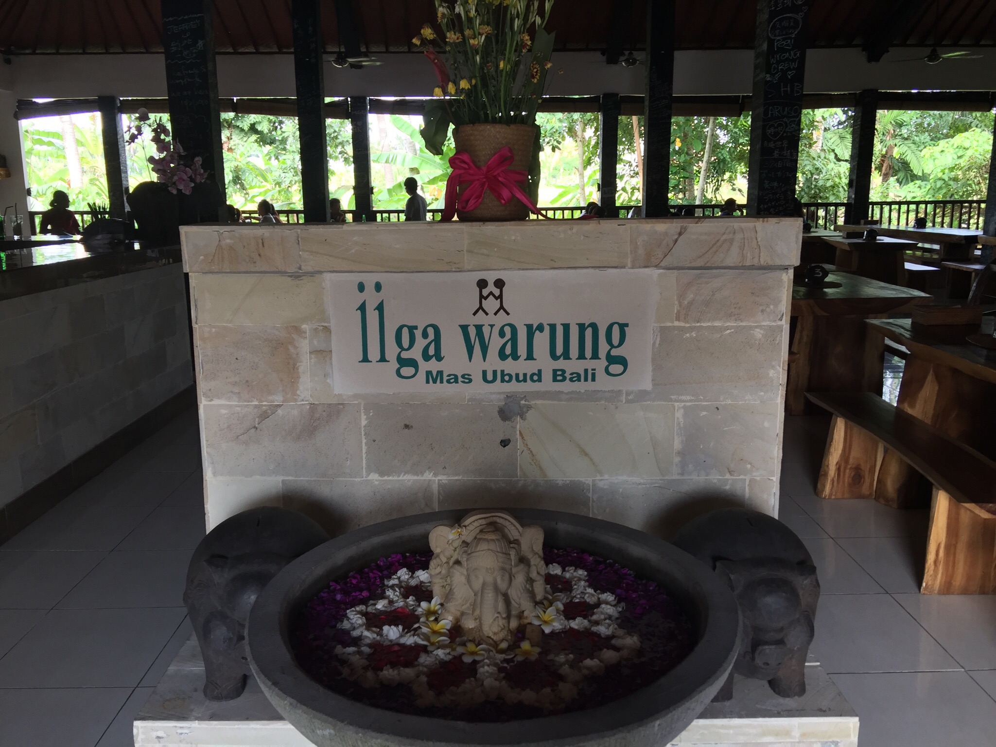 空港からウブドまでは1時間程度。ガイドさんがバリ島の情報について冗談を交えながら面白く説明してくれました。 昼食はウブド近くのガイドさんおすすめのiiga warungへ。 店内。お昼を過ぎていたので、空いていました。 …