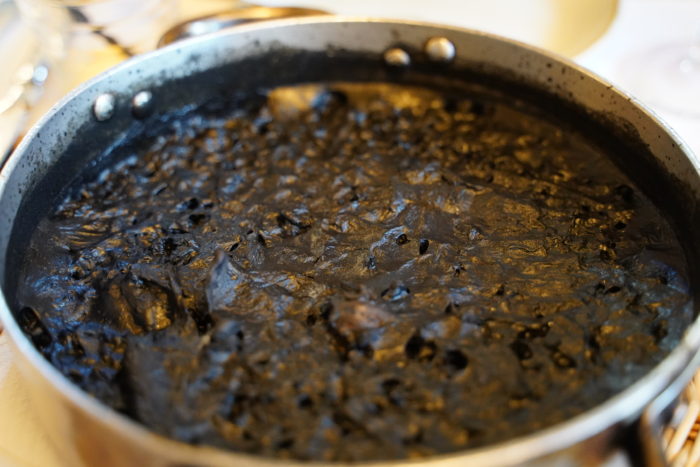 イカスミのパエリア、キッズメニューのハンバーガーセット、サングリアをデキャンタで頼みました。パエリアは写真の通り、イカスミのパエリアはそのままでも美味しいですが、アリオリソースと合わせて食べると、絶妙な味の組み合わせになり、深みが増すというか、とにかく美味しいです。日本で食べるのとはレベルが違いました。混んでいたこともあって料理が出てくるのに時間がかかりますが、こちらのお店は待つ価値があると思います。大満足!