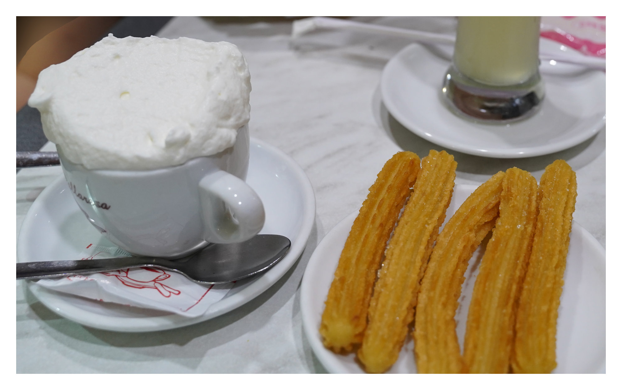 スペインはチュロス発祥の地と言われています。繁華街にチュロスの屋台があったり、カフェのメニューにもあったり、ここでは日常食のようです。自分の中で、日本ではディズニーランドで食べるイメージしかありませんでしたw