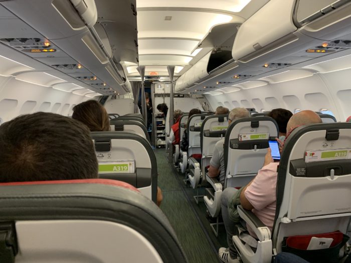 初ポルトガル航空。機内は清潔で、1時間しか乗っていませんが、乗り心地もよかったです。簡素ながら飲み物も機内食もきちんと出ました。短い時間なのに神業だと思いました。座席は3-3の配列で、後部に若干の空席があるものの、前方は座席が埋まっていました。ポルトガルから日本への直行便があると嬉しいですが、そこまで渡航需要はなさそうだし、ヨーロッパの最西端という立地からEU内の乗り継ぎ需要も取り込みづらいから難しいかな。