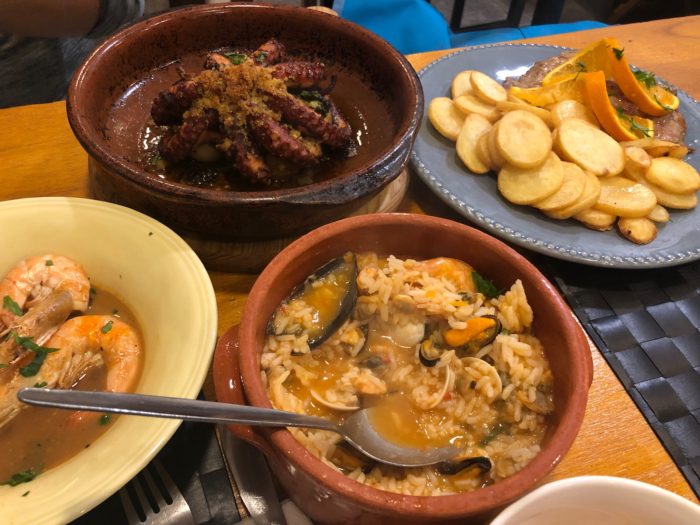 予約時間より少し早く着きましたが、名前を伝えていると丁寧にも予約席へ案内してもらえました。Instagramに投稿されていたタコ丸ごと1匹をグリルされた料理がとても美味しそうだったのでタコ料理(どのメニューなのか分からず、お店の人に写真を見せました)、海鮮のリゾット、ボイル海老、写真を見てやはり美味しそうだった豚肉のなんとか?を注文。ハンサムな男性スタッフから勧められたボトルのワインが6ユーロだったので、合わせてお願いしました。レストランでボトルのワインがこの値段って安すぎません?日本だったらグラスビール1杯ですよ?西ヨーロッパなのにお財布に優しいです。ポルトはメジャーな都市ではないためと思いますが、だからこそ、お勧めしたい街です。