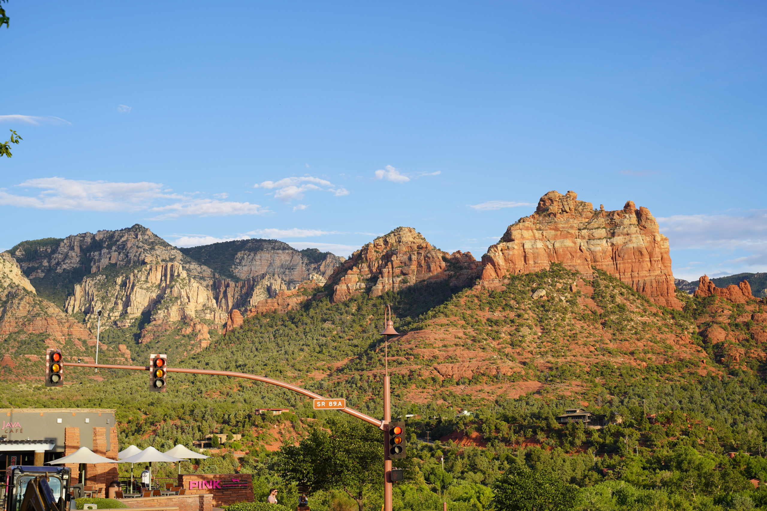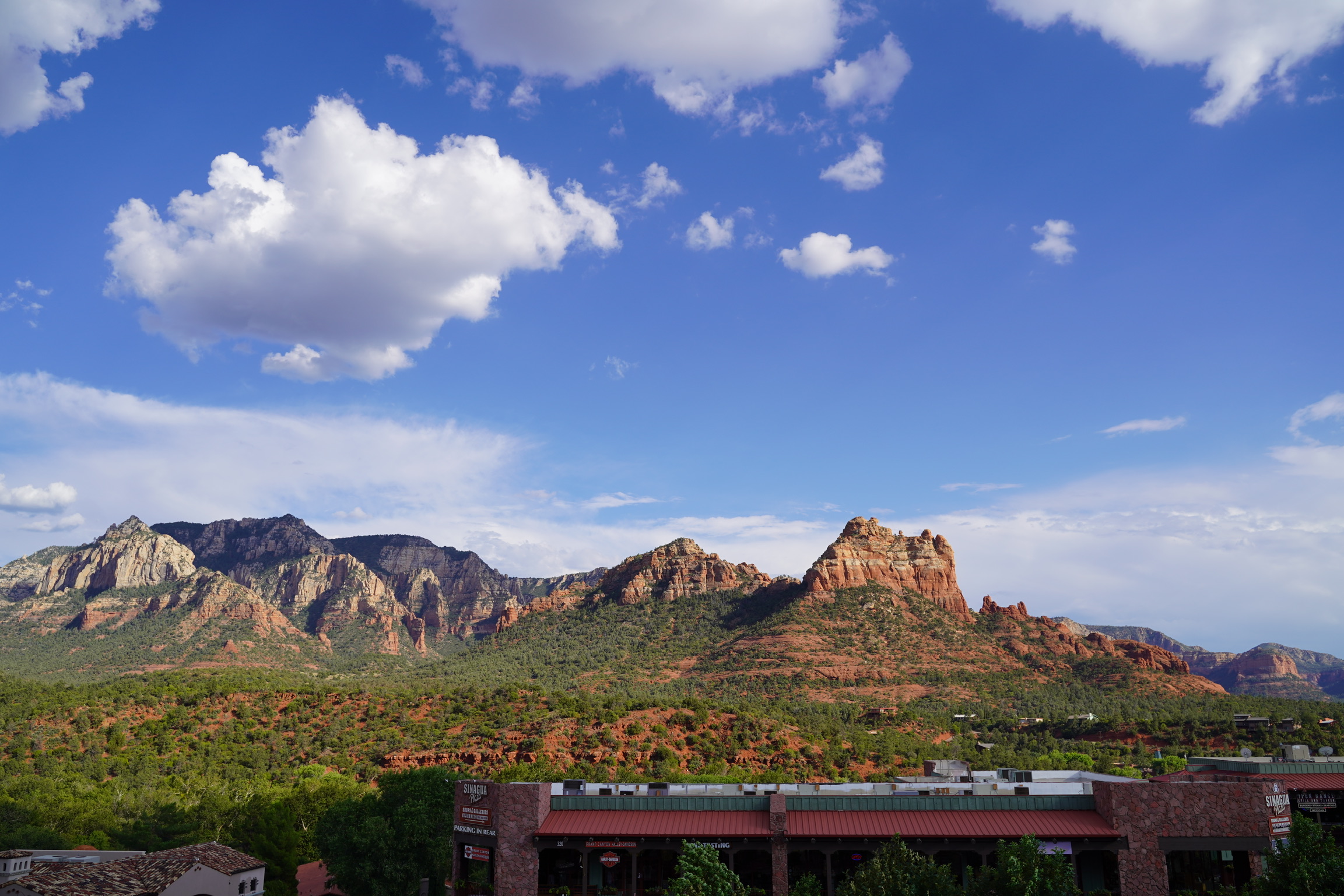 フェニックス近郊は数メートルはありそうな巨大サボテンが生えていて、飽きませんでした。セドナ方面へ進んでいくと標高が高くなってくるようで、サボテンは見えなくなりました。山岳地帯に入ると雲行きが怪しくなり、途中激しい雷雨に見舞われました。峠を抜けてしばらく走っていると青空が見えてきて、茶色の岩山が前方に現れました。セドナへ到着です。