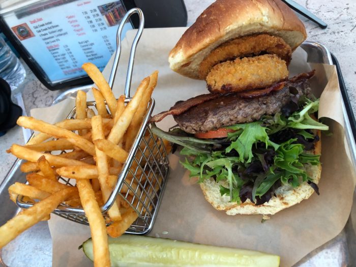 セドナの夜は早いです。18時頃には店が閉まり始めるので、早めに夕食を取ります。Canyon Breeze Restaurantというお店でハンバーガーを食べました。ここはセドナの岩山をバックに、テラス席で食事できるお店で、ジューシーなお肉で良かったです。店内入り口には別店舗でジェラート屋さんがあり、濃厚な味で、子供が喜んで食べてました。
