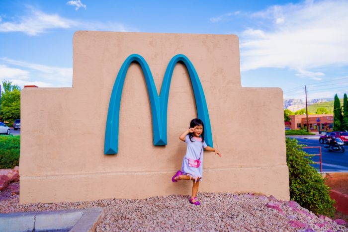 ホテルへチェックインする前に、セドナのマクドナルドへ寄りました。ここは世界唯一、青色のマクドナルド看板があるのです!先にいた日本の若い女の子2人組が写真を撮ってくれました。