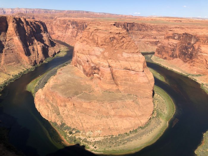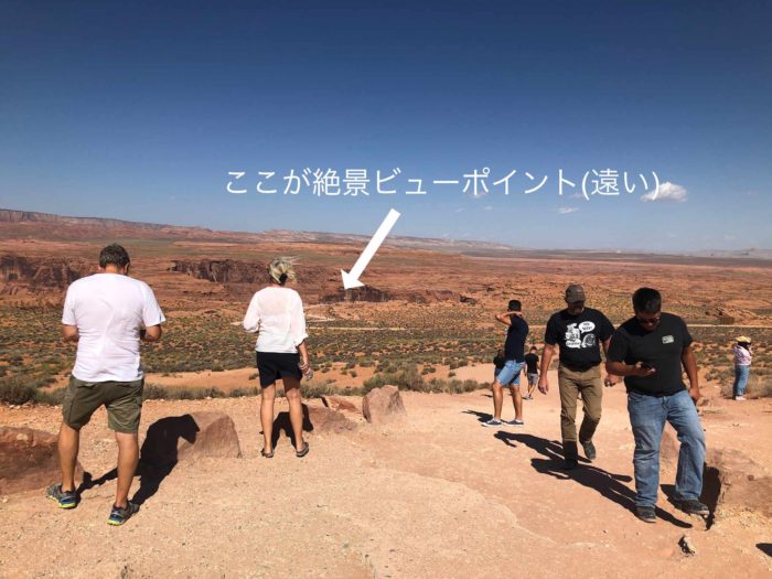 ホースシューベンドの駐車場から絶景ポイントまではかなり歩きます。見晴らしがよい分、逆に沢山歩かないといけないことが分かり、気持ちが萎えてきます。片道20分くらいでしょうか。途中、足場がサラサラの砂地へ変わり、歩きにくさが体に堪えます。