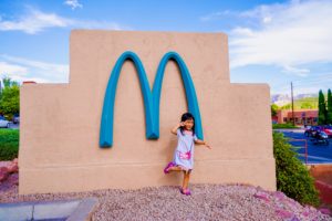 14時頃にツアー事務所へ戻り、14:20頃にモニュメントバレーへ向けて出発。1時間ほど走り、途中の街カエンタのタコベルで、遅めの昼食を取りました。日中時間帯の割引をやっていたので、タコスを食べまくりました。